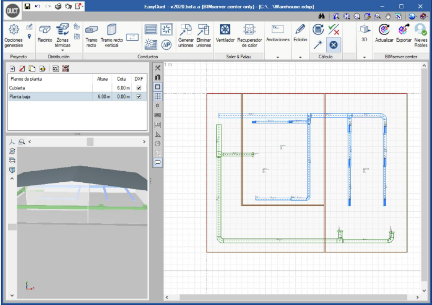 El cálculo de las instalaciones se realiza mediante el diseño de los planos de planta (2D), pero también muestra la instalación y geometría en 3D para facilitar al usuario la visión de la instalación. Además de realizar el dimensionamiento de la instalación y seleccionar el producto (ventiladores o recuperadores de calor), también permite generar los diferentes documentos de proyecto, como por ejemplo: planos en 2D, lista de materiales o tabla con los cálculos realizados.