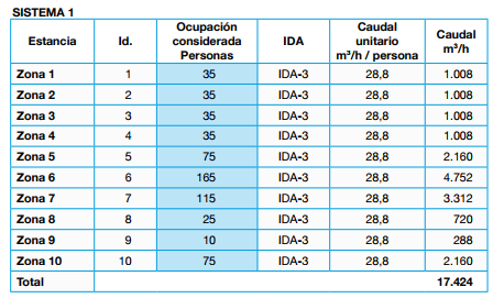 La siguiente tabla muestra, para cada estancia, los caudales estimados de acuerdo con la ocupación prevista y los caudales indicados en la tabla 1.4.2.1.