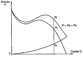 Es la representación gráfica de todos los estados caudal-presión de que es capaz un ventilador. Nos remitimos a la Hoja Técnica VENTILADORES 1: CURVA CARACTERÍSTICA, en donde se trató monográficamente el tema. Su representación en la Fig. 3 muestra una Curva Característica típica con expresión de las tres presiones mencionadas. Para cualquier ordenada en la gráfica, se cumple:
