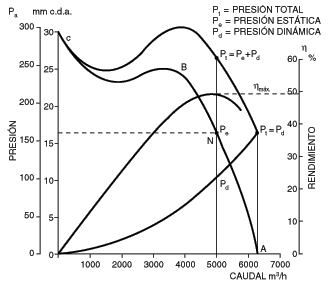 La Fig. 2 representa una curva tipo en la que se han grafiado las presiones estáticas, que representan las pérdidas de carga, y las totales y dinámicas. También se representa una curva de rendimiento mecánico del aparato.