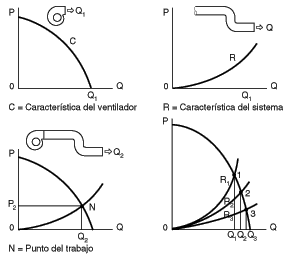 Si disponemos de la característica resistente del sistema, podemos encontrar de forma fácil el punto de trabajo de un ventilador acoplado al mismo sin más que superponer las curvas características del ventilador y resistente del conducto según se indica en la Fig. 3.