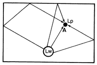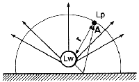 Si la fuente sonora está situada cerca del suelo, Fig. 5, el nivel de presión sonora en un punto A es suma del sonido directo y del reflejado por el suelo. En este caso, en que la propagación es semiesférica, la relación entre Lp y Lw es: