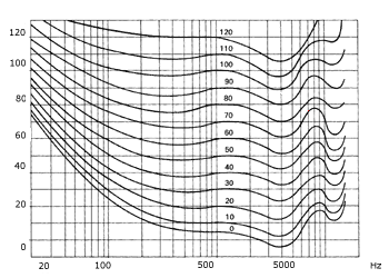 Del examen de estas curvas se deduce que la sensibilidad del oído humano disminuye para frecuencias muy bajas y muy altas, teniendo la máxima para unos 4.000 Hz. Además, para complicar las cosas, este fenómeno es más acusado a niveles de presión sonora bajos que a los altos.