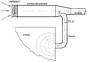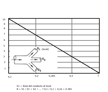 Si al local considerado va a parar sólo el caudal del ramal 1, es evidente que no todo el ruido del ventilador le alcanzará. Se puede calcular el espectro de la potencia de la onda propagada por el conducto que interesa, restando del ventilador el valor determinado por el uso de la gráfica de la Fig. 10.