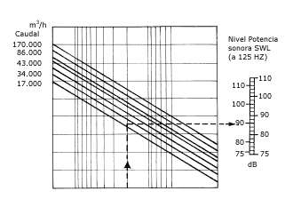 Supongamos un ventilador axial que da 4000 m³/h a una presión de 500 Pa (50 mm c.d.a.). Según el nomograma, a 125 Hz le corresponde un SWL de 90 dB. Su espectro será el que figura al pie, que se ha obtenido sumando los 90 dB a las correcciones indicadas en la tabla correspondiente.