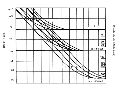 Una vez calculado el valor de R y conocido el factor de directividad Q, que nos da la Tabla 1, estaremos en condiciones de utilizar el gráfico de la Fig. 7, el cual para cada distancia r, del punto considerado A a la fuente, obtenemos un valor en dB que debemos sumar al nivel de potencia sonora Lw, para conocer el nivel de presión sonora Lp en el punto A.
