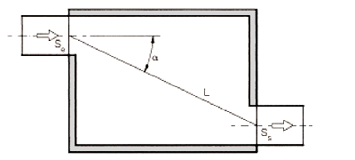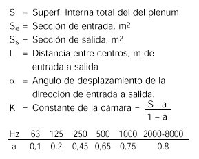 La Fig. 4 muestra un esquema en que el efecto de la energía sonora que penetra por la boca de entrada es igual como lo hace en una habitación pequeña, la que atraviesa hasta alcanzar la salida. Al igual que en la misma, la presión sonora a la salida, y por tanto la potencia sonora que transmite, comprende la energía radiada desde la entrada y la de reverberación de la cámara. La atenuación puede calcularse por la fórmula: