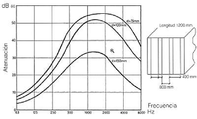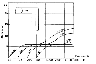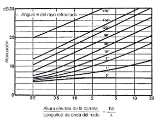 La atenuación de estas barreras puede calcularse mediante el gráfico de la Fig. 12 en la que λes la longitud de la onda sonora que depende de la frecuencia f (Hz) y que puede calcularse mediante la siguiente expresión, cuando el ruido se transmite por el aire: