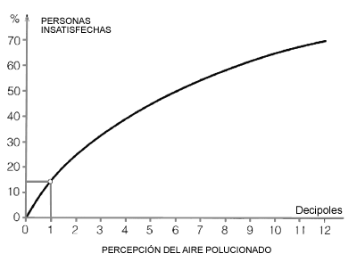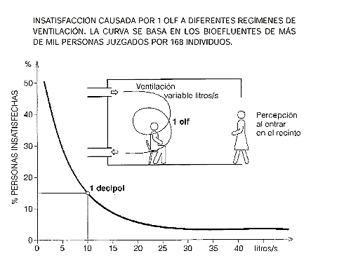 La insatisfacción causada por un Olf en función del coeficiente de ventilación, expresada por un colectivo de personas que califican como inaceptable el ambiente de un lugar en el momento de penetrar en él, se grafía en la Fig. 8. La relación entre los decipoles que reinan en un local y el número de personas insatisfechas que sufren el mismo, se representa en la Fig. 9. Un decipol insatisface el 15 % de las personas investigadas y para alcanzar un 50 % de disconformes, la polución debe llegar a los 6 decipoles.