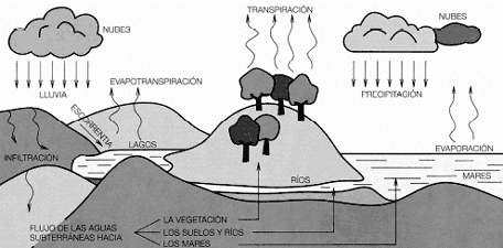 Dentro del sistema global mar-tierra-aire se conoce como "ciclo hidrológico" la representación conceptual de intercambio de agua sobre la superficie terrestre, que se esquematiza en el diagrama de la Fig. 1.