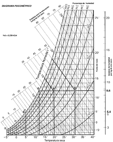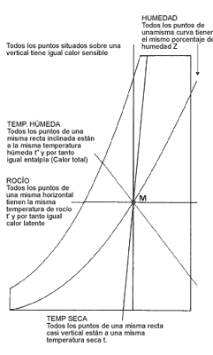 En esta fórmula dos parámetros, el calor total y el vapor x, son función de la temperatura húmeda y la de rocío. Así pues, con la temperatura seca t tenemos relacionadas las tres y fijadas dos, puede determinarse la tercera. Basado en esta fórmula se ha construido el diagrama sicrométrico de la Fig. 5 cuya estructura se representa y explica en la Fig. 3. Así: