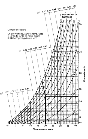Una variante del diagrama sicrométrico es la indicada en la Fig. 4 que con una serie de rectas dan el volumen de la unidad de aire, esto es, por kilo de aire seco.