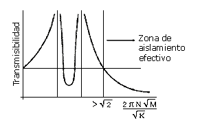 En estos casos ha de considerarse la frecuencia natural de la propia estructura que se interrelacionará con la del silent-block. De una manera sencilla podríamos decir que en estas condiciones la curva de transmisibilidad toma la forma de la Fig. 26 de modo que el aislamiento empieza a ser efectivo para valores mayores que la 2 y por tanto se requerirán unos aisladores con rigideces aún menores que nos llevarán a deflexiones más grandes que las del caso anterior.