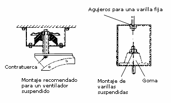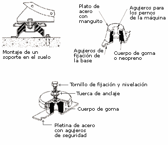 En otros casos, como por ejemplo en ventiladores centrífugos con el motor separado y correas, suele ser necesario diseñar una base rígida que se apoye sobre varios silent-blocks, estratégicamente repartidos para que queden igualmente cargados y que naturalmente, den la deflexión adecuada al conjunto. Fig. 34.
