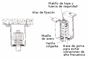 Donde se necesiten deflexiones muy grandes o un gran aislamiento a baja frecuencia, se utilizan aisladores basados en muelles metálicos. En el mercado existen modelos que pueden alcanzar deflexiones hasta 175 mm. Debido a esta capacidad tan grande de deflexión, estos conjuntos llevan unos tornillos de nivelación para ajustar la posición de la máquina en el momento de su instalación. Otra característica que incorporan estos tipos metálicos, son unas piezas de goma de pequeña deflexión que evitan las vibraciones o ruidos de frecuencias audibles que podrían viajar a través del muelle, pasando directamente a la estructura soporte. También hay modelos para montajes inferior y superior Fig. 29 y 30.
