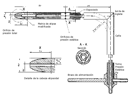 Deben hacerse un número importante de lecturas, en unos puntos concretos del conducto. Según la norma ISO 5801:1996 (E) una de las varias sondas que describe se muestra en la Fig. 1 con las indicaciones correspondientes. La misma norma fija los puntos exactos donde debe hacerse la lectura de presiones. El centro de la nariz de la sonda debe colocarse sucesivamente en no menos de 24 posiciones espaciadas simétricamente dispuestas como se indica en la Fig. 2.