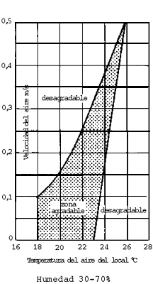 El gráfico de la Fig. 9 muestra la zona de sensación agradable teniendo en cuenta el par de valores temperatura del local y velocidad del aire. Influye también de forma importante la humedad. Este gráfico es válido para valores entre el 30 y el 70%.