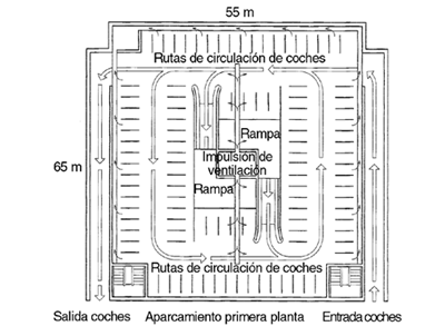 El ejemplo de cálculo de la ventilación de un aparcamiento subterráneo está desarrollado en la Hoja Técnica Casos de Aplicación, Ventilación de Aparcamientos I y Ventilación de Aparcamientos II.