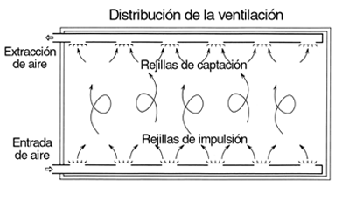 Una vez conocido este valor hay que tener en cuenta situar las bocas de extracción de aire lo más cerca posible de los focos contaminantes, que el circuito de aire que se establezca pase por zona nociva para arrastrar los vapores perjudiciales y que lleguen al exterior sin atravesar los lugares ocupados por el personal. Finalmente, hay que procurar que el aire expulsado no vuelva a entrar, por lo que situaremos alejadas unas de otras las bocas de salida y las de entrada de aire en el local.