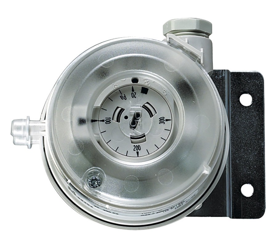 Prise de pression positive en ambiance. 1 contact sec (libre de potentiel) repos/travail pour signalisation défaut, pouvoir de coupure 1A résistif (0,5A inductif) sous 250V maxi. Indice de protection : IP54.